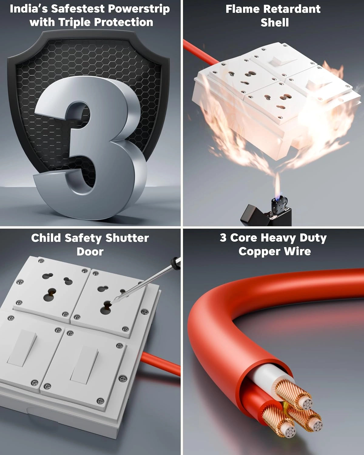 ▶FLAME RETARDANT ABS BODY: Fire-Resistant ABS Body for Maximum Durability: The Power Strip's body is made from premium-quality Acrylonitrile Butadiene Styrene material that is fire-resistant, ensuring maximum durability and safety. Built to withstand harsh electrical conditions, making it the safest power strip for any home or office environment, it assures you that your devices are always protected against unforeseen electrical events