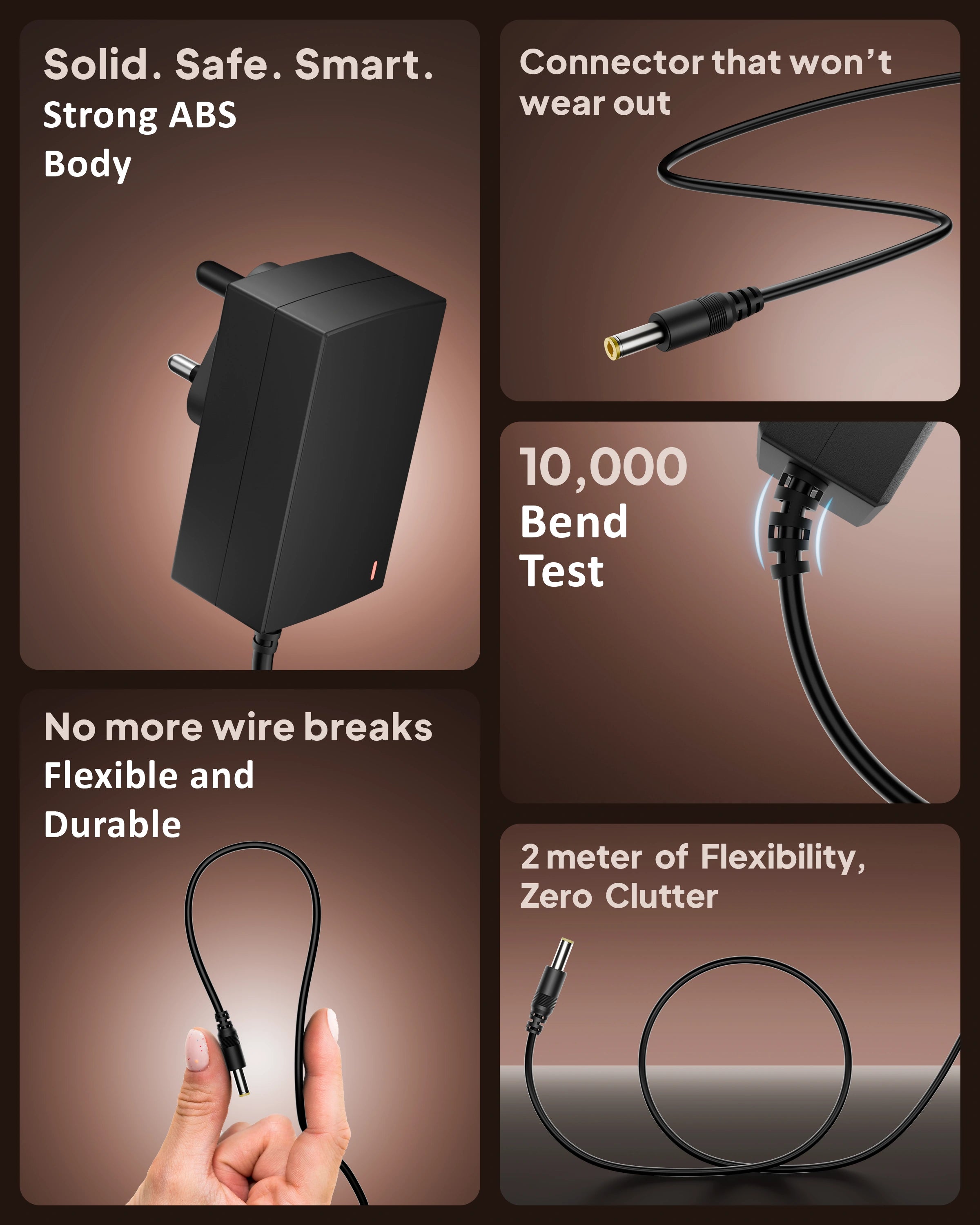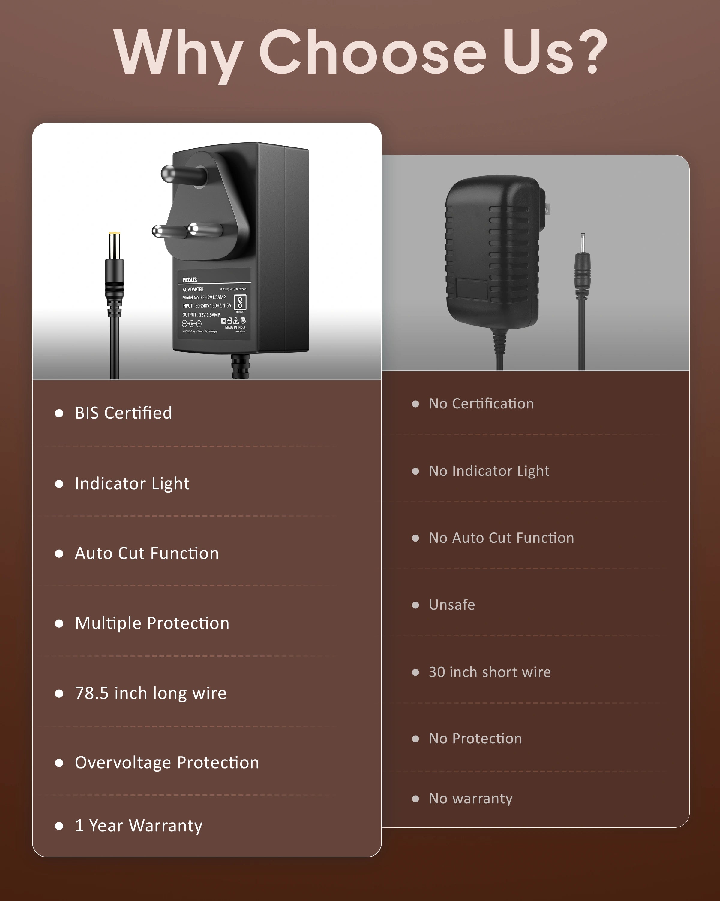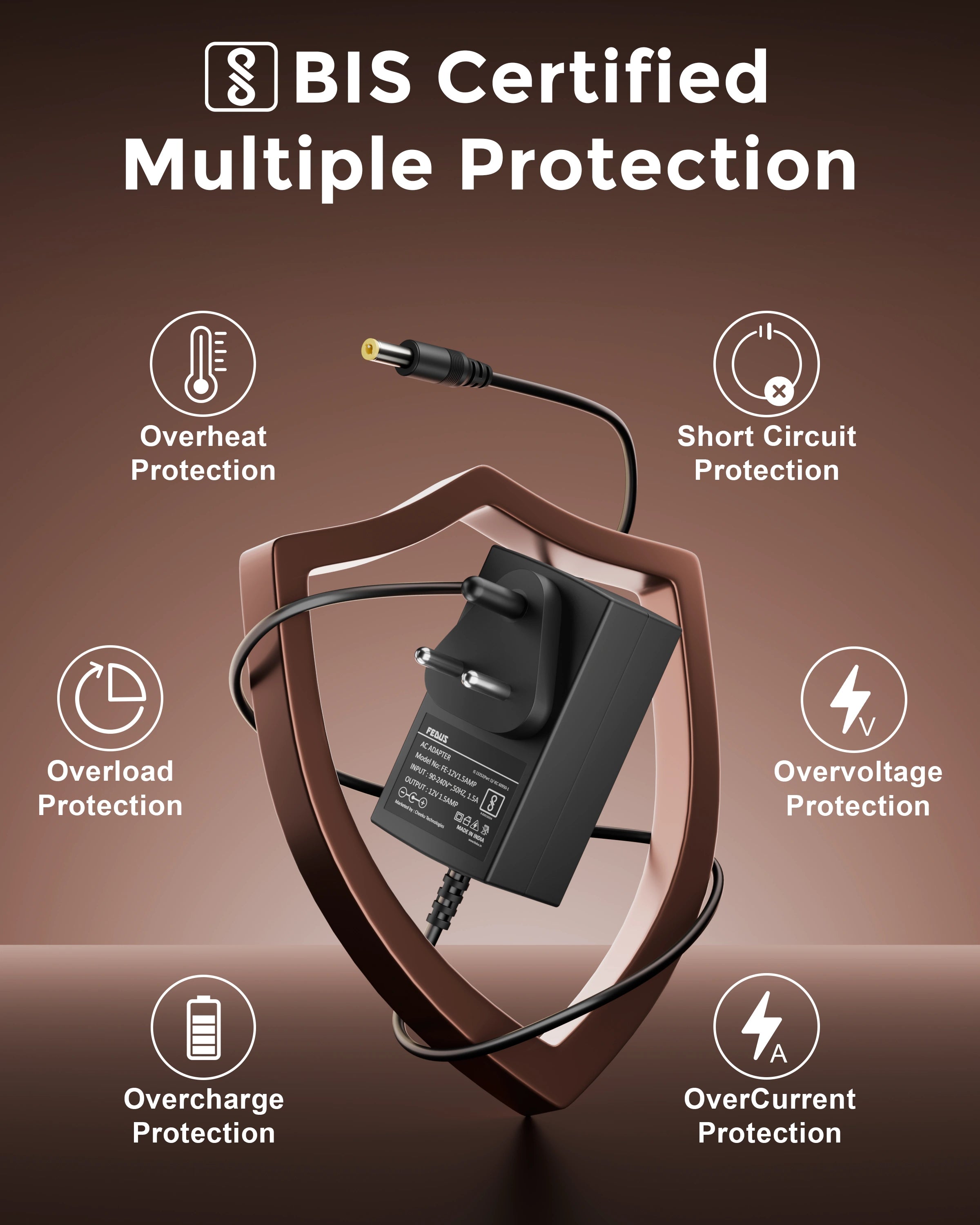 • ▶BIS-CERTIFIED: BIS has tested and certified the FEDUS power adaptor. That means it meets industry safety standards, ensuring the safety of you and your family. It was rigorously tested to withstand intense heat without failure, ensuring the product's durability. This power adapter is one of the safest power supplies on the market, allowing you to use it with confidence.