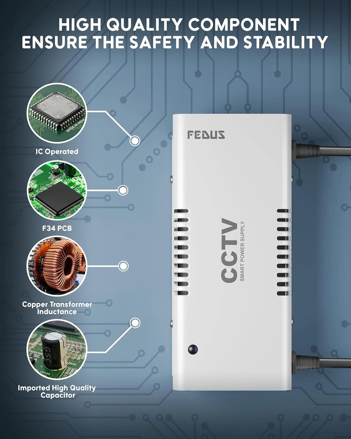 ▶ HEAVY DUTY METAL BODY & SUPERIOR COOLING: FEDUS CCTV power supply comes with a premium metal body SMPS design that acts as a high-performance heat sink. Unlike plastic 12V adapters, our industrial-grade metal casing prevents overheating during 24/7 continuous operation, ensuring a longer lifespan for your surveillance system.