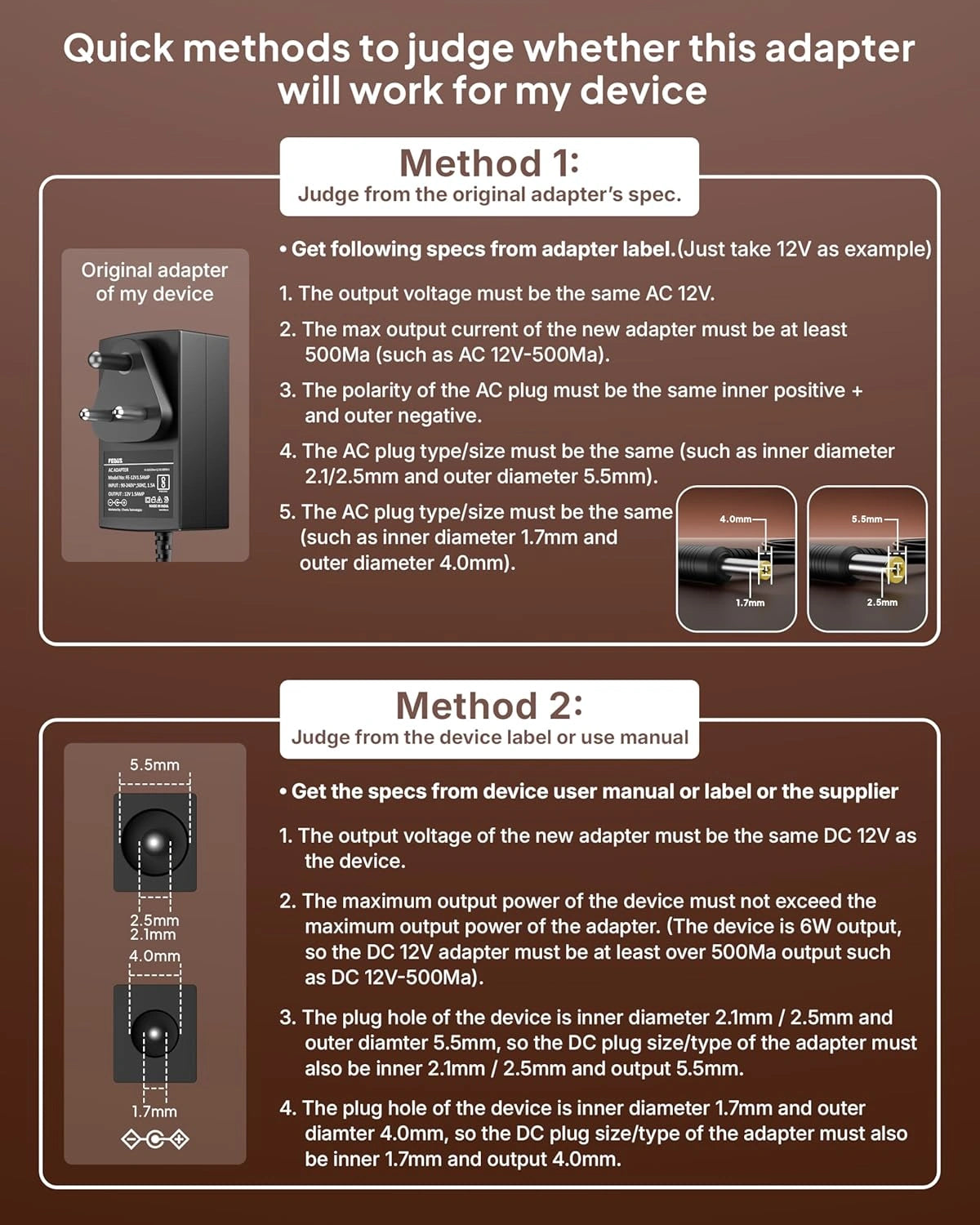 ▶NOTE: Before ordering, ensure the power adaptor pin dimensions match the dimensions shown in the image description, or check the DC pin size of your old power adaptor or the female DC port of your Device. Its voltage should be 12V only, and the current(Amps) should not exceed 500mAH amps. If you are still confused, use the image of your adapter to verify which power adapter will work best for your device.