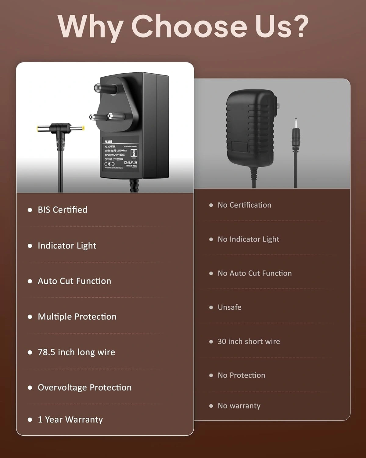 ▶BIS-CERTIFIED: BIS has tested and certified the FEDUS power adaptor. That means it meets industry safety standards, ensuring the safety of you and your family. It was rigorously tested to withstand intense heat without failure, ensuring the product's durability. This power adapter is one of the safest power supplies on the market, allowing you to use it with confidence.