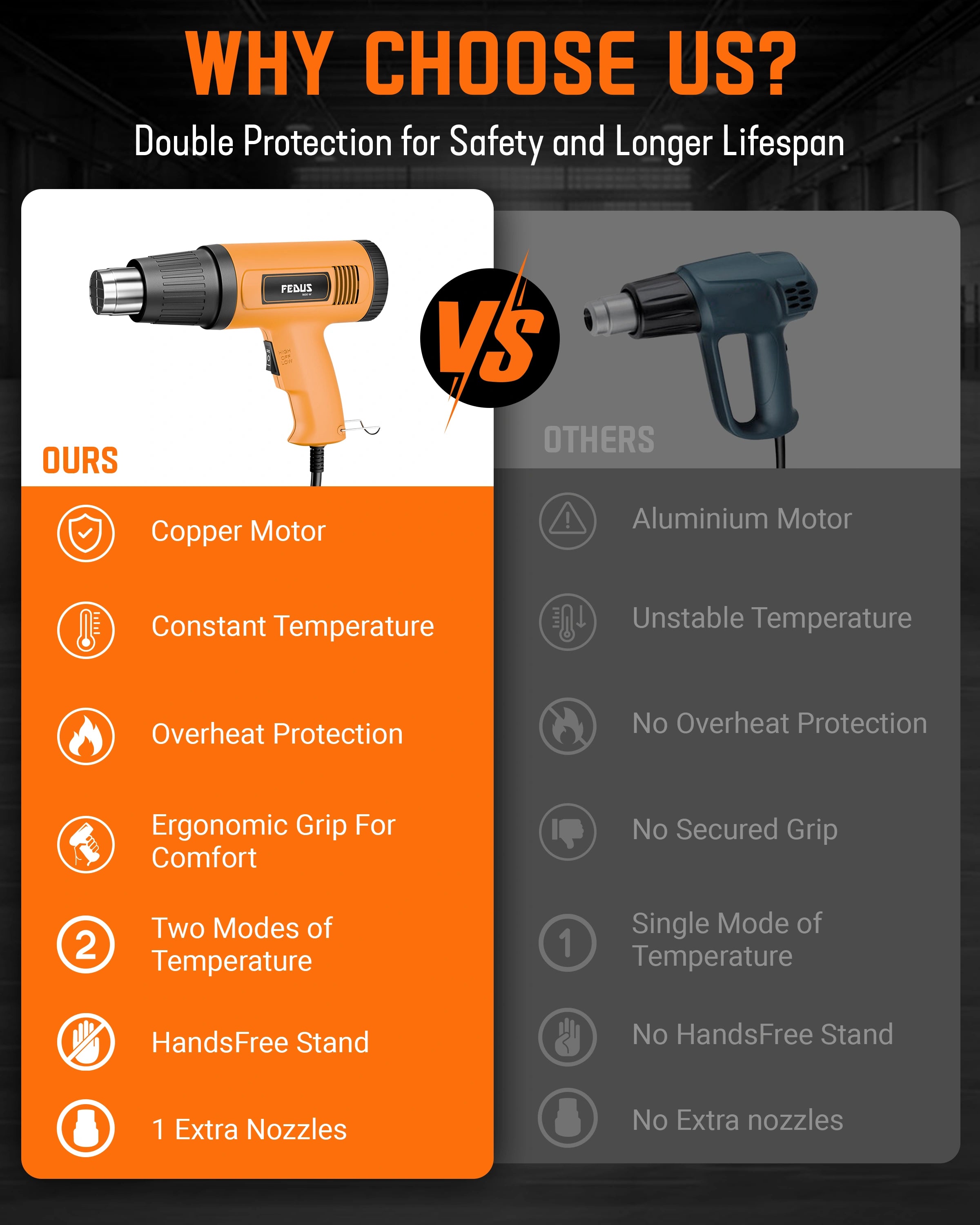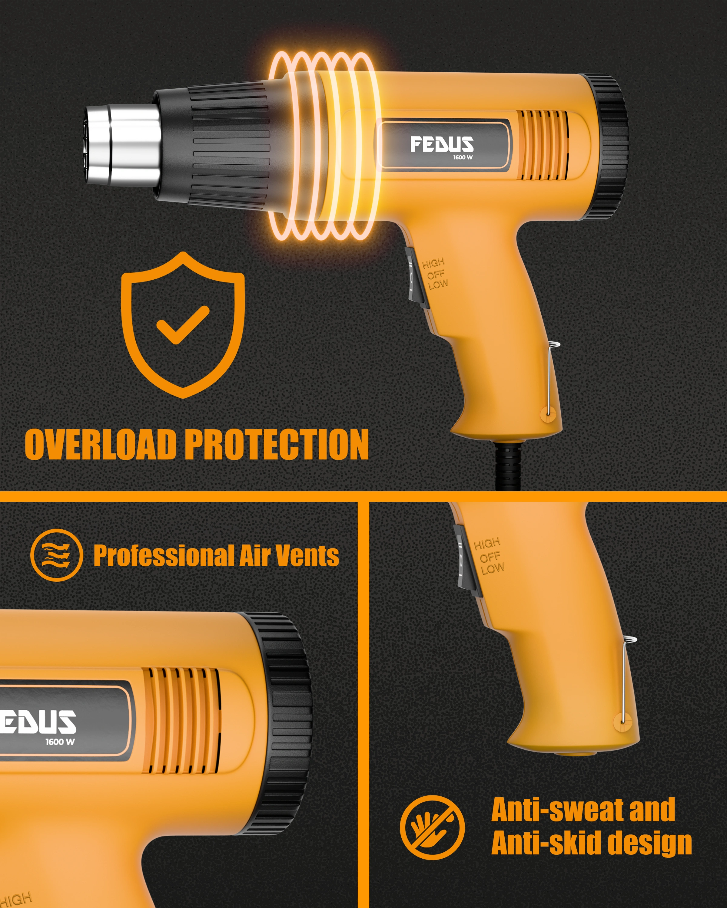 • ▶WORRY-FREE AFTER-SALES SERVICE & LONG SERVICE LIFE: The components of this hot air gun are made to last and encased in a high-durability shell. The oxidation heating wire, fan, and mica board are all made of high-temperature-resistant material, & an all-copper motor supports a product lifespan of up to 800 hours. Fedus provides a high-quality Heat Gun with a 6-month warranty from the date of purchase and lifetime customer service.Please do not hesitate to contact us via our customer care number