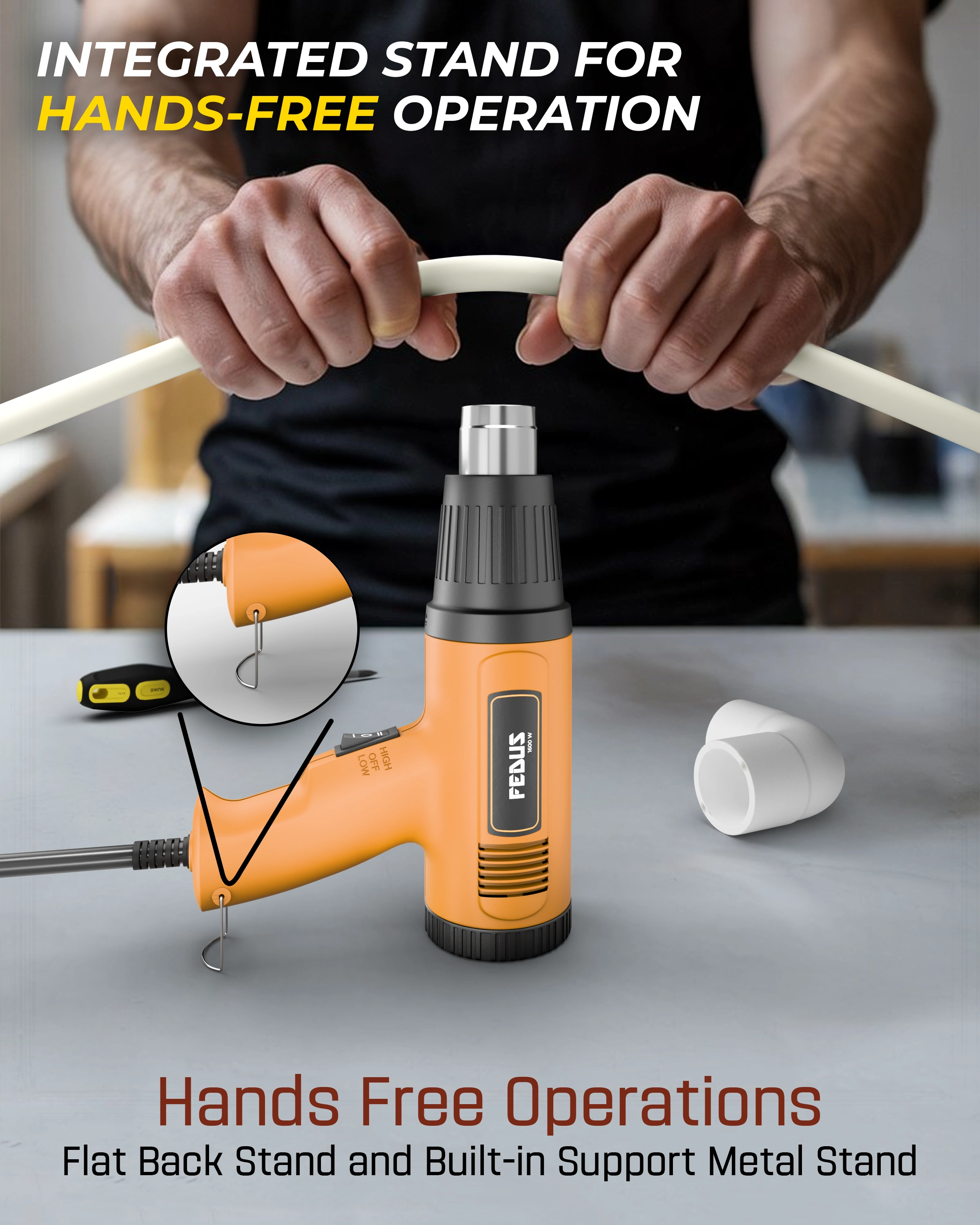 • ▶CONVENIENCE USE & HANDS-FREE: The heat gun can also stand by itself to free your hands, so you can focus more on your workpieces, no matter it's shrink connectors or PVC pipes. It allows the heat gun to cool down safely after finishing the operation. The ergonomic handle design fits the palm, providing comfort and reducing fatigue & comes with hook for easy storage; the scientific ergonomic design handle prevents strain injuries from long-term use and makes holding the heat gun easier for longer