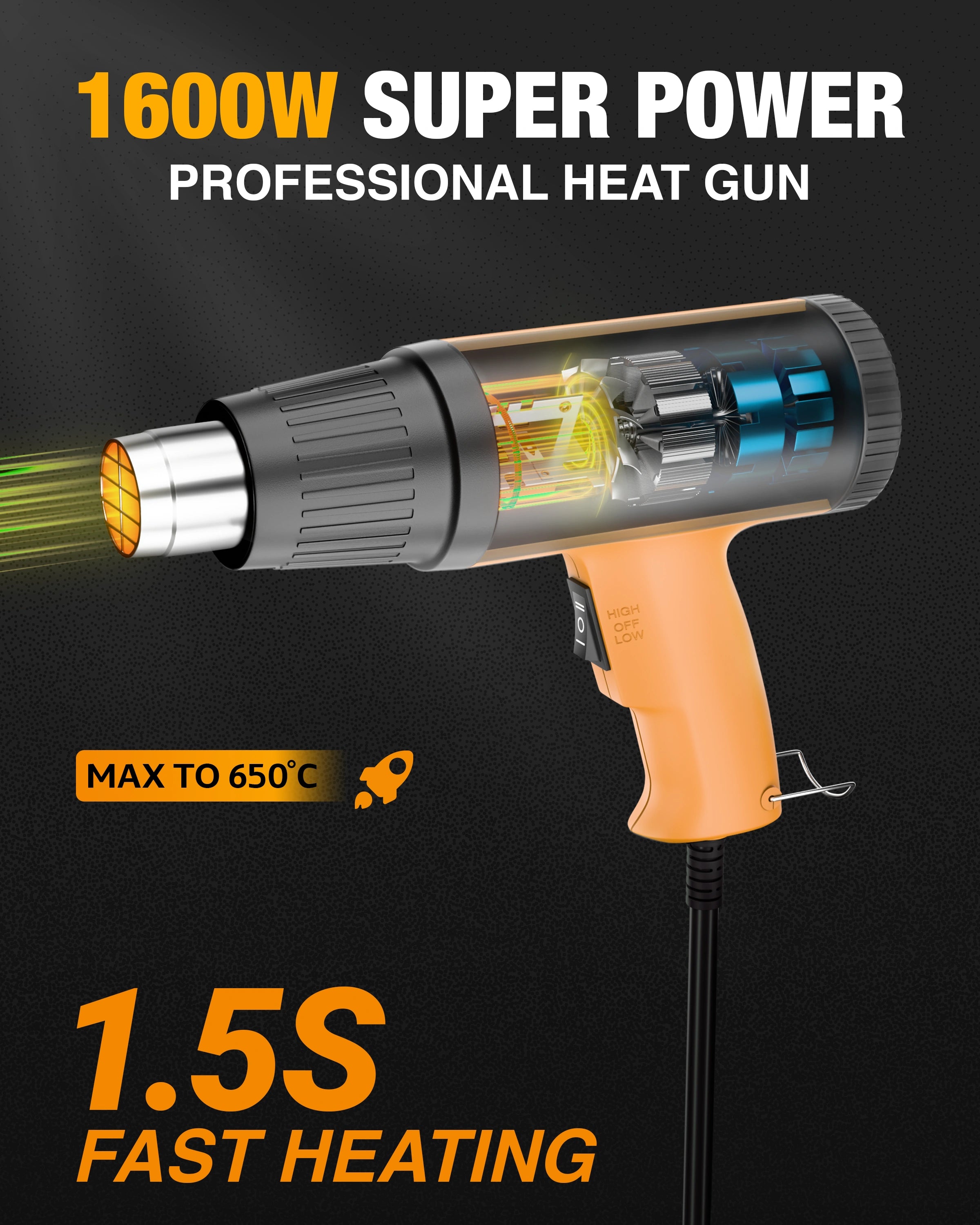 • ▶HIGH-POWERED & DUAL-TEMP CONTROL: Unlike other heat guns, our heat guns provide variable temperature control. The red stepless temperature control roller provides rheostat-type heating, the high/low switch on its handle provides airflow control, and The high-performance 1600W heat gun heats up quickly in just a few seconds. Equipped with dual temperature modes, users can freely switch between a low-temperature setting (180C) and a high-temperature setting (650C)