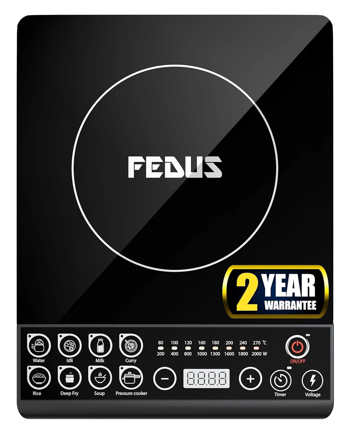 • ▶BIS-CERTIFIED: The FEDUS induction stove has been tested and certified by BIS. It meets industry safety standards, making it safe for you and your family. The heating surface is not just any ceramic glass but a heavy-duty, shatter-proof one. It was rigorously tested to withstand intense heat without shattering, ensuring the product's durability. This stove is one of the safest cooktops on the market, allowing you to cook confidently, knowing that Fedus's surface won't break, crack, or shatter.