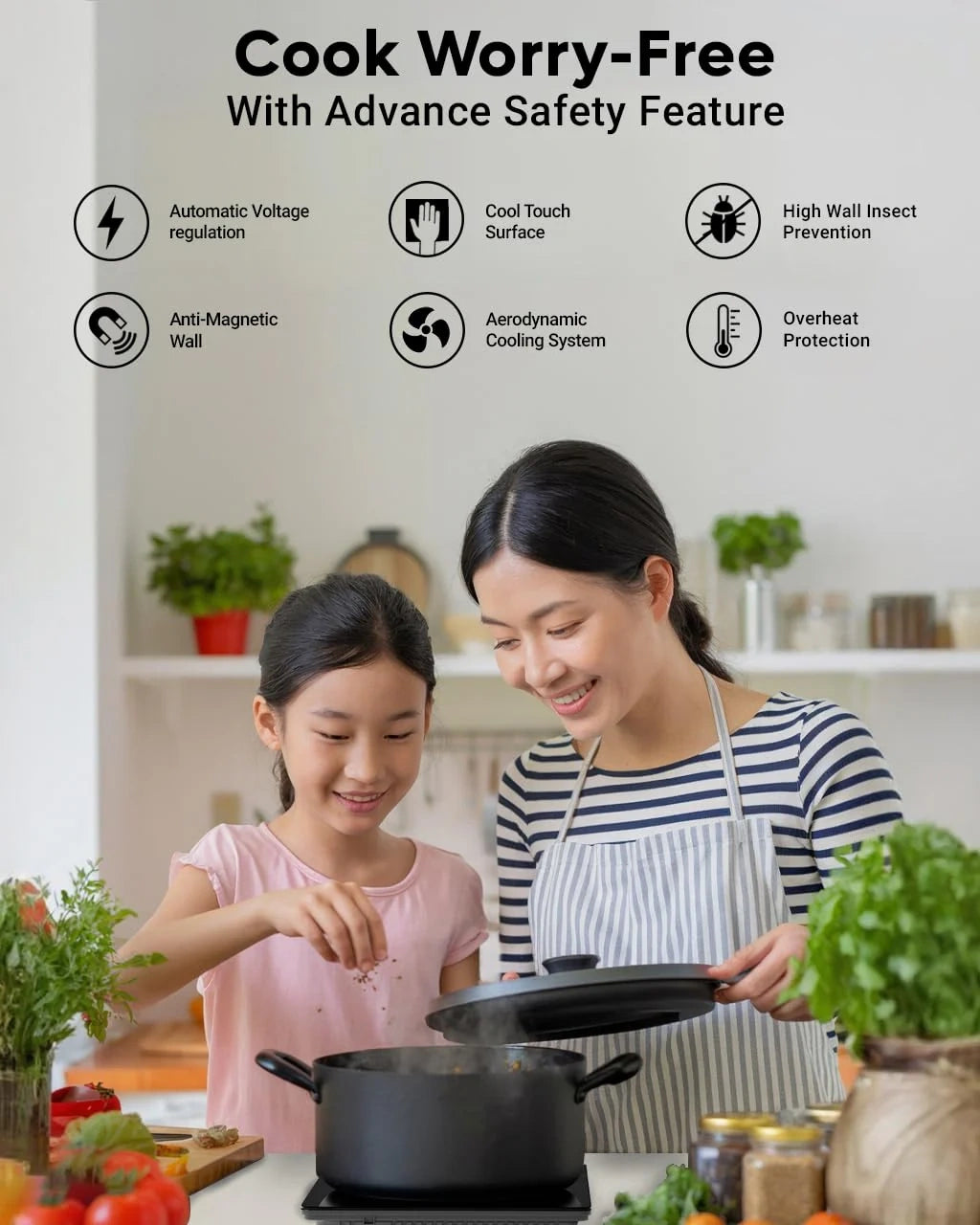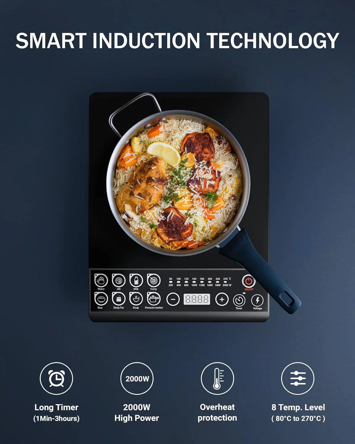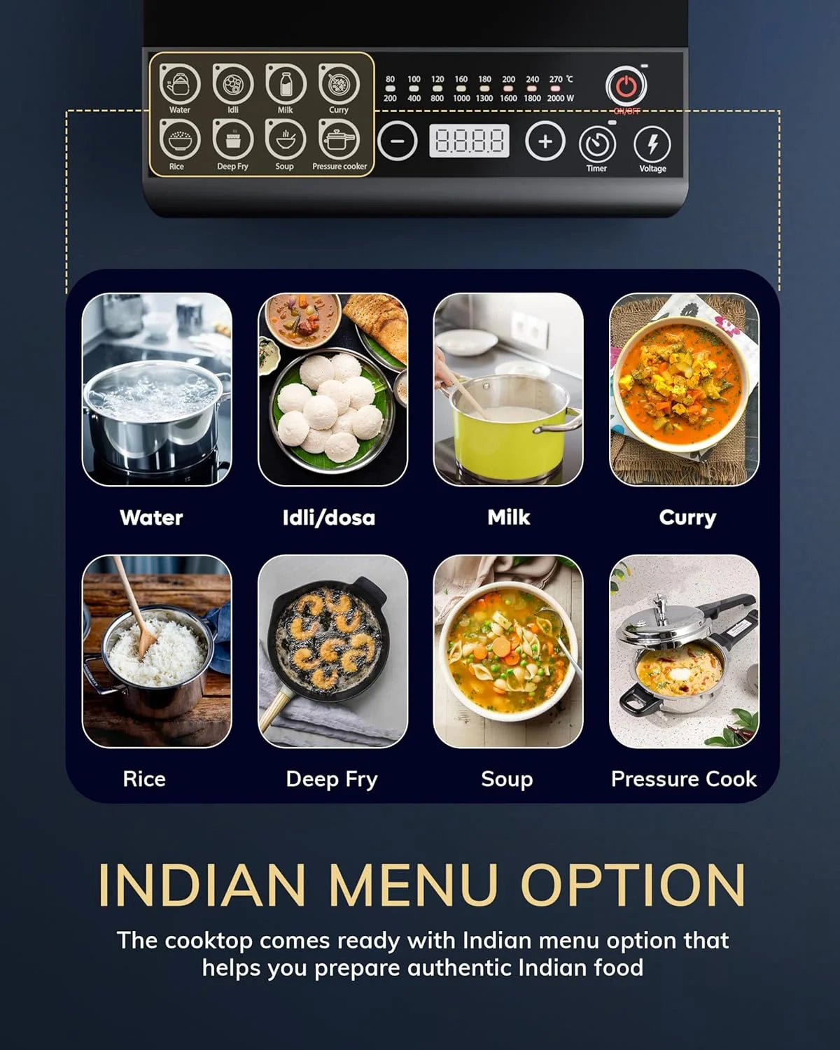 • ▶INDIAN MENU OPTION WITH 8 TEMPERATURE: The cook-top comes with ready Indian Menu Options that help you prepare authentic Indian food like Chapati, Idli and Dosa, curries to rice, at the touch of a button, and have 8 power levels (80°C 270°C, 200W to 2000W) You can cook thousands types of food by spending just a few seconds, It’s so easy that you might not even believe it, perfect for braise, warming food, fry, simmer, steaming, boil, stir-frying, roast. Slow boiling, sauté, sear, steam