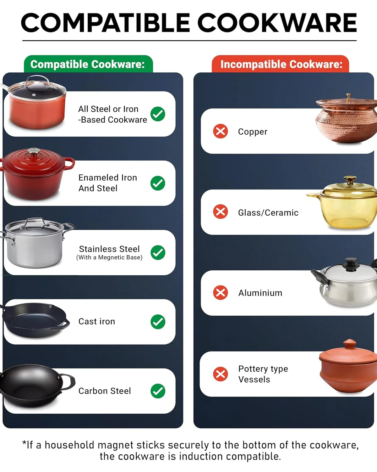 • ▶COMPATIBLE COOKWARE: Using an induction cooktop is a breeze, especially when you have the right cookware. You need to use cookware with a magnetic bottom, such as cast iron, enameled steel, or magnetic stainless steel; the simple rule is that if your cookware is induction-ready, the magnet will easily stick to its bottom. If you still need clarification. Automatic pan detection will automatically shut down the appliance after 60 seconds if no cookware or incorrect cookware is detected.