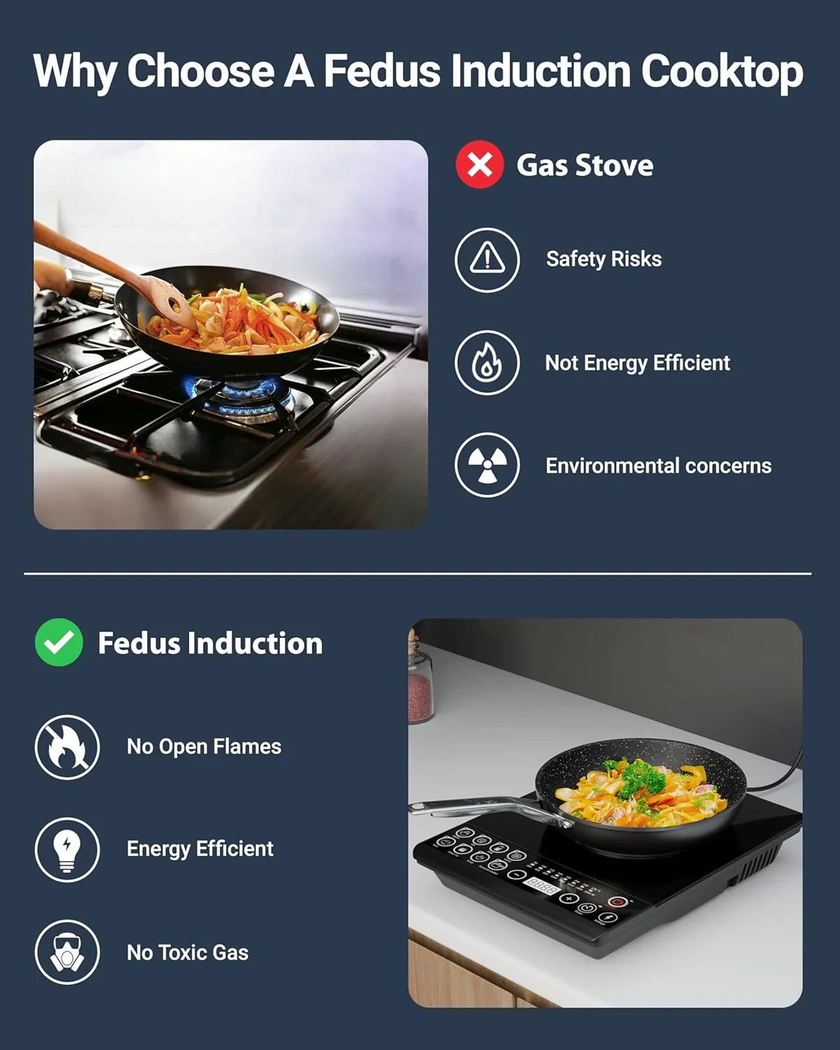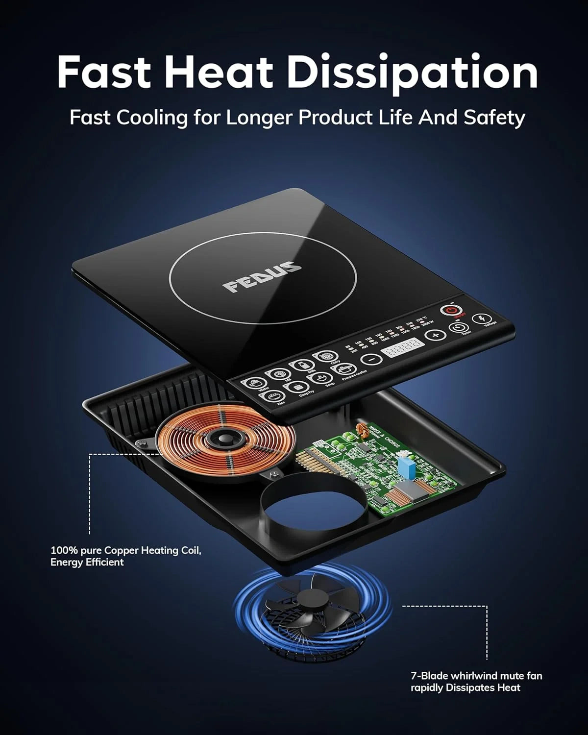 • ▶STYLISH AND PORTABLE: With a thickness of only 2.35 inches. The design makes this portable induction cooktop very eye-catching in your kitchen and more accessible to carry than a gas stove. Whether you are going on a trip or cooking in your kitchen or backyard, these Fedus electric cooktop burners will be a good choice. They can also be used with outdoor power stations or solar panels. Perfect for indoor and outdoor use in home kitchens, restaurants, dorms, RVs, apartments, gardens, cabins etc.