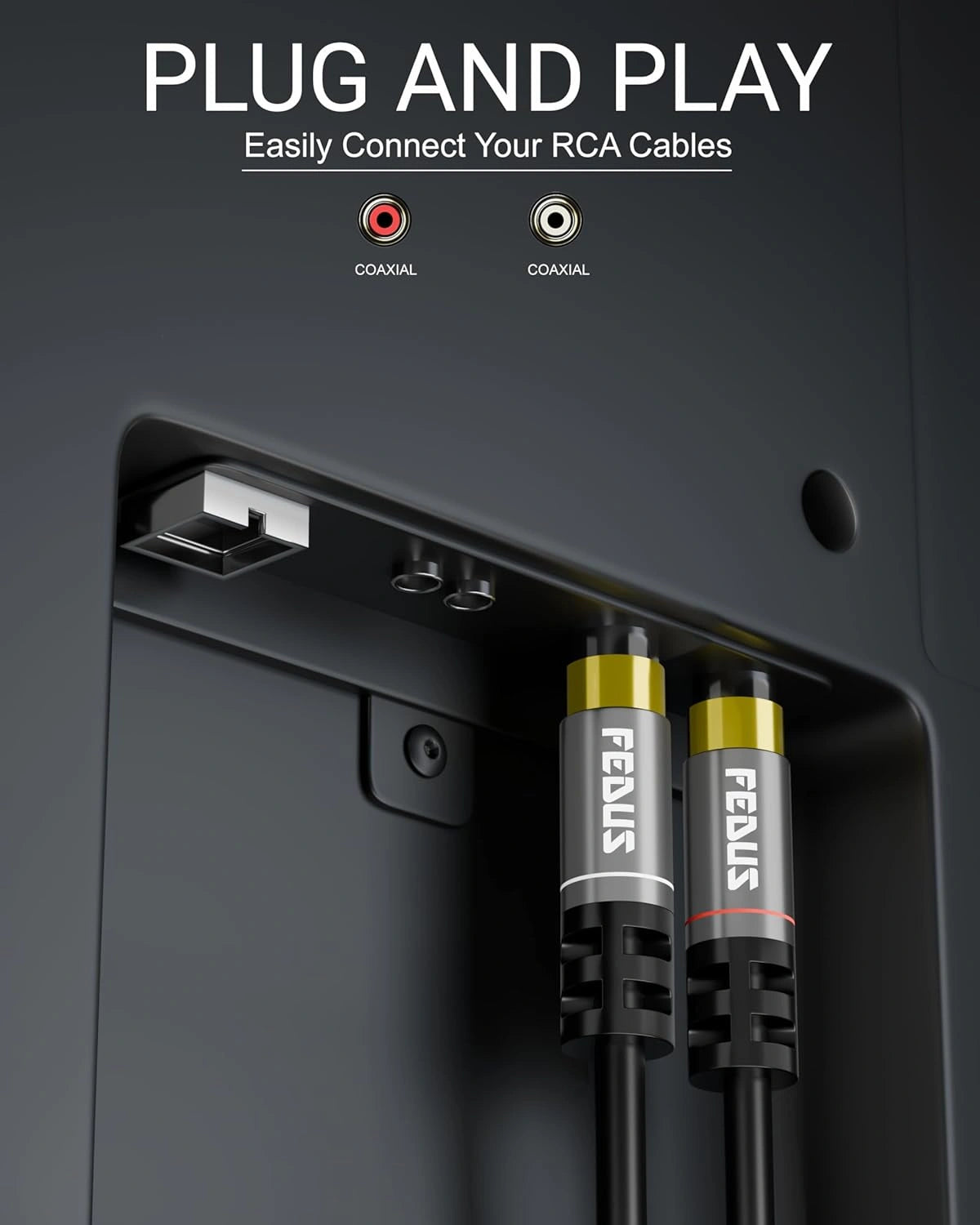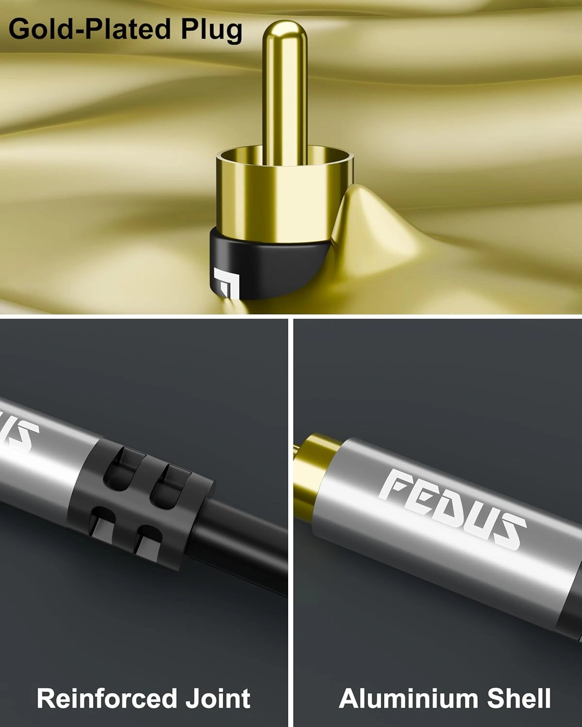 • ►METAL HOUSING AND BI-DIRECTIONAL CONNECTOR: This FEDUS RCA subwoofer cable is equipped with premium metal housing to provide longer-lasting durability versus other PVC connectors on the market. The RCA connectors have easy grips for plugging and unplugging while ensuring reliability. The Bi-Directional feature also seamlessly transmits stereo audio for high-quality sound and is separated with common red and white male RCA plug colors.