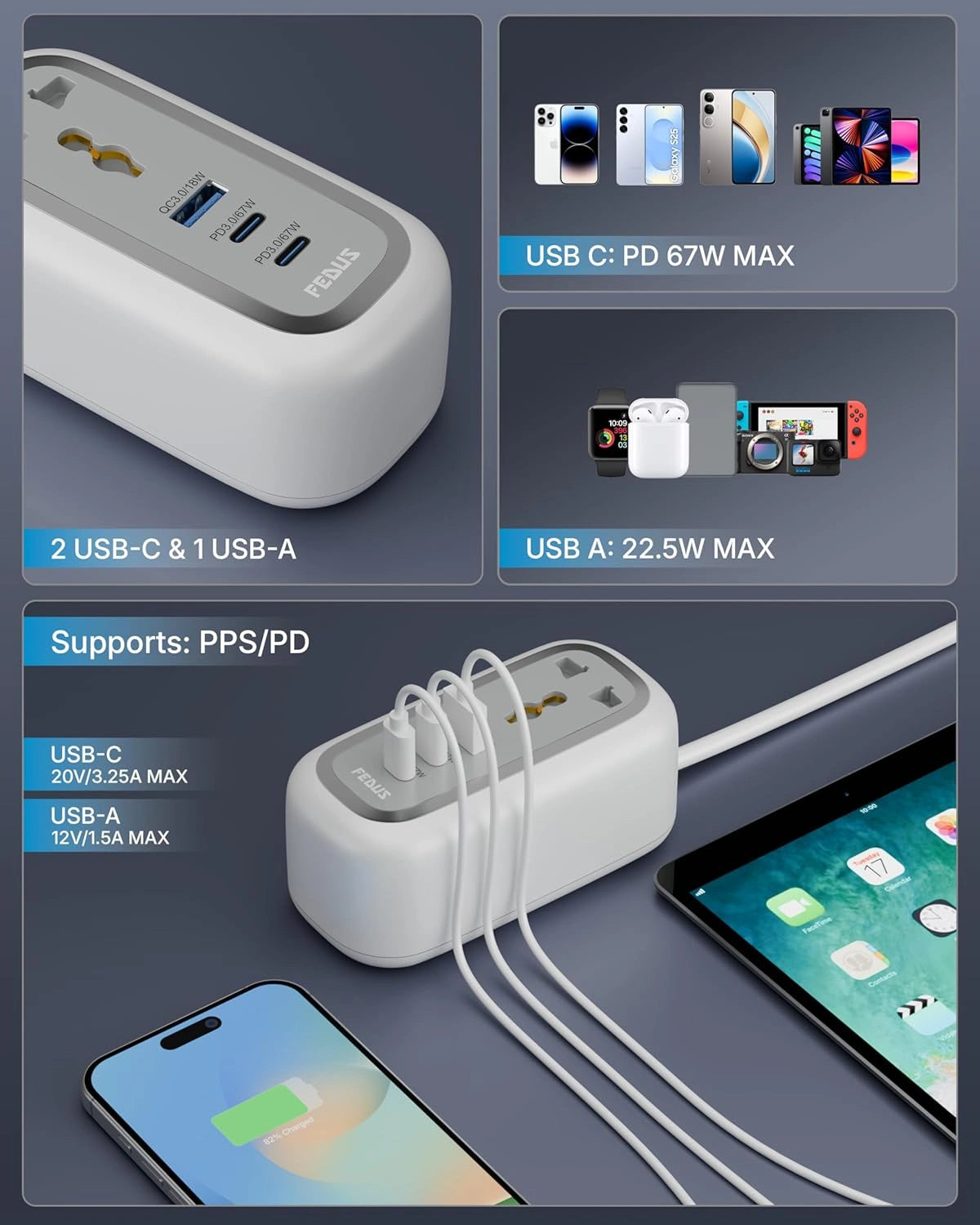 ▶5 IN 1 TRAVEL POWER STRIP WITH USB C PORTS: FEDUS Desktop Power strip supports 5 devices simultaneously, including 2 USB-C, 1 USB-A, and 2 AC outlets. When you're frustrated by the single outlet on the hotel bedside table, the portable power strip can solve your charging problems by powering multiple cell phones, watches, tablets, headphones, trimmers, laptops, hair dryers, or other electronic products simultaneously. Perfect for frequent travelers and business trips.