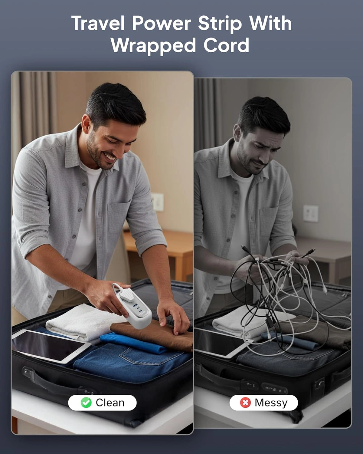 ▶CLUTTER-FREE, COMPACT & BEAUTIFUL DESIGN: Sleek, pocket-sized, and highly portable. Easy to pack in your purse, backpack, or carry-on. Unlike standard strip plugs, our 2 Universal AC Ports are intelligently distributed on different sides. This clever spacing ensures that even your largest and bulkiest AC plugs (like those for laptops or hair straighteners) can be plugged in simultaneously without blocking the USB ports or the other AC port.