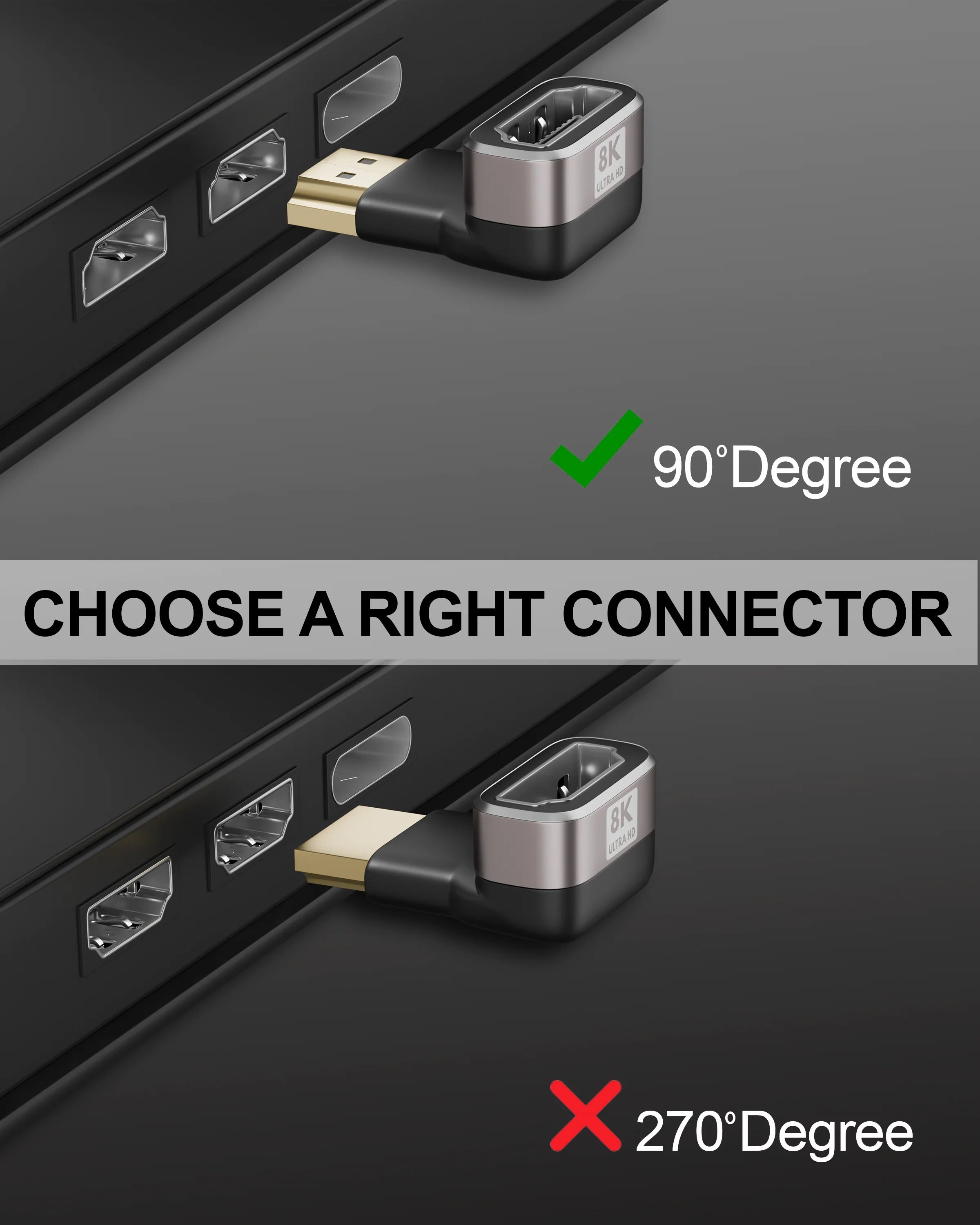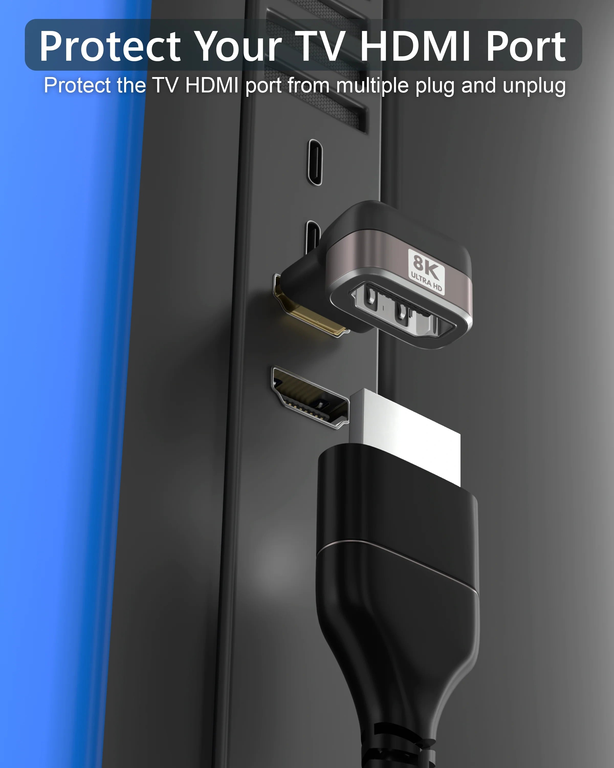 • ▶FIT NARROW SPACE: L-Shaped body easily used on any tight spaces between HDMI device and wall; with this 90-degree HDMI adaptor, Direct the cable up or down depending on the orientation of the HDMI port on your equipment, which is super handy for connecting HDMI cables at narrow space; It perfectly protects your cables from bending damage or breakage. Also, it reduces the stress on the ports of your valuable devices.