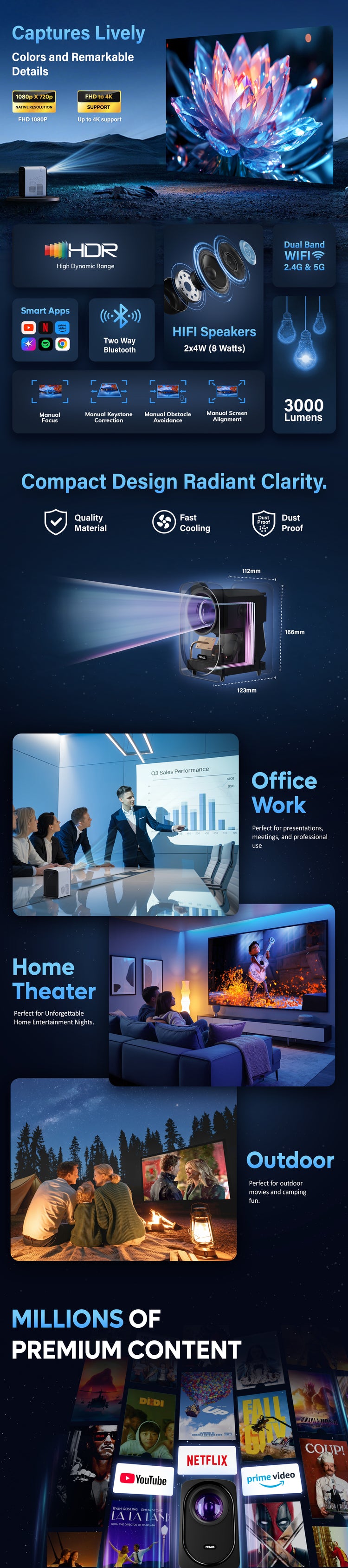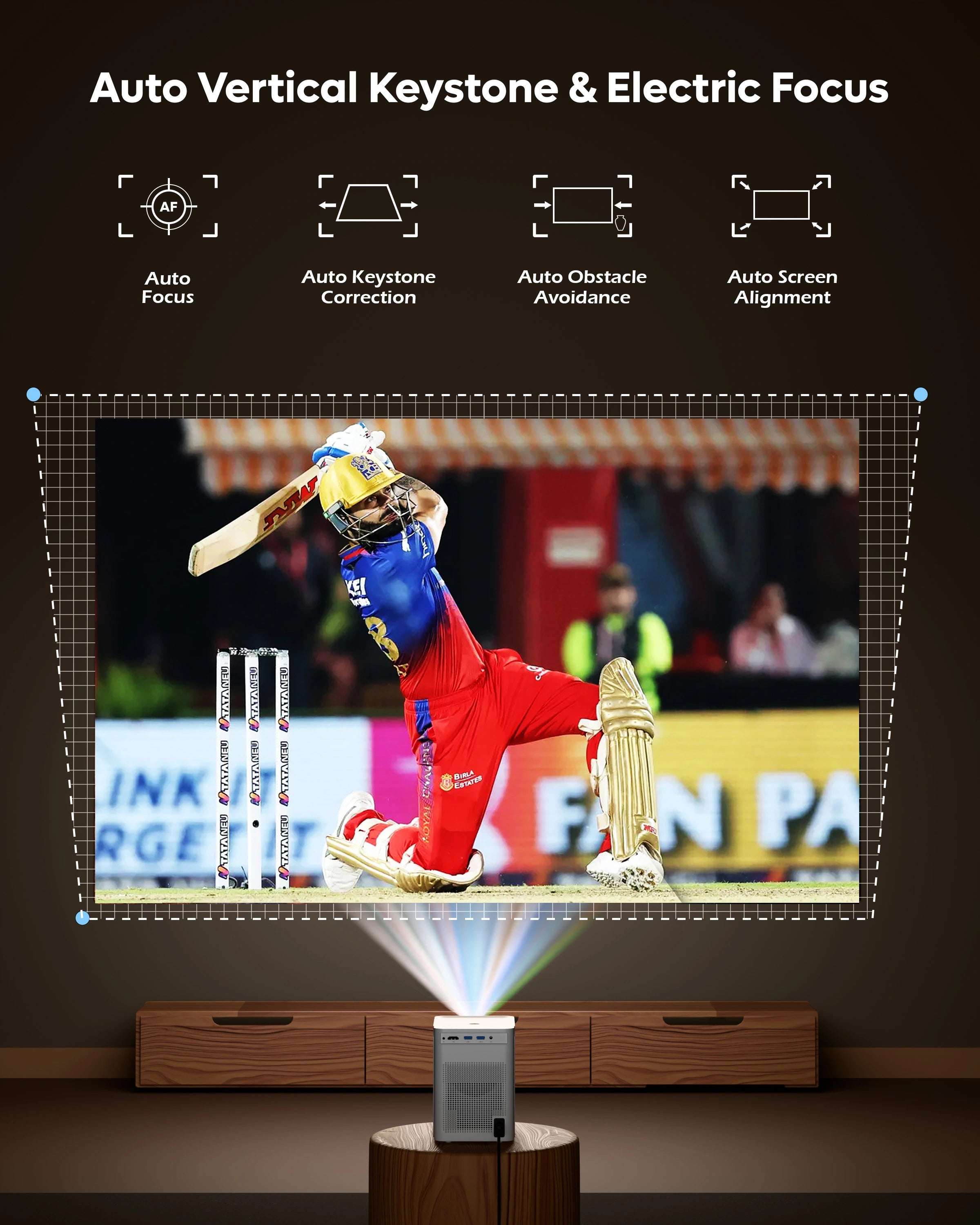 ▶ SHARP & BRIGHT VISUALS: With 3600 Lumens brightness, advanced lens technology, and Auto Focus + Auto Keystone Correction, every frame looks sharp and aligned. Auto Obstacle Avoidance & Auto Screen Alignment make setup effortless.
