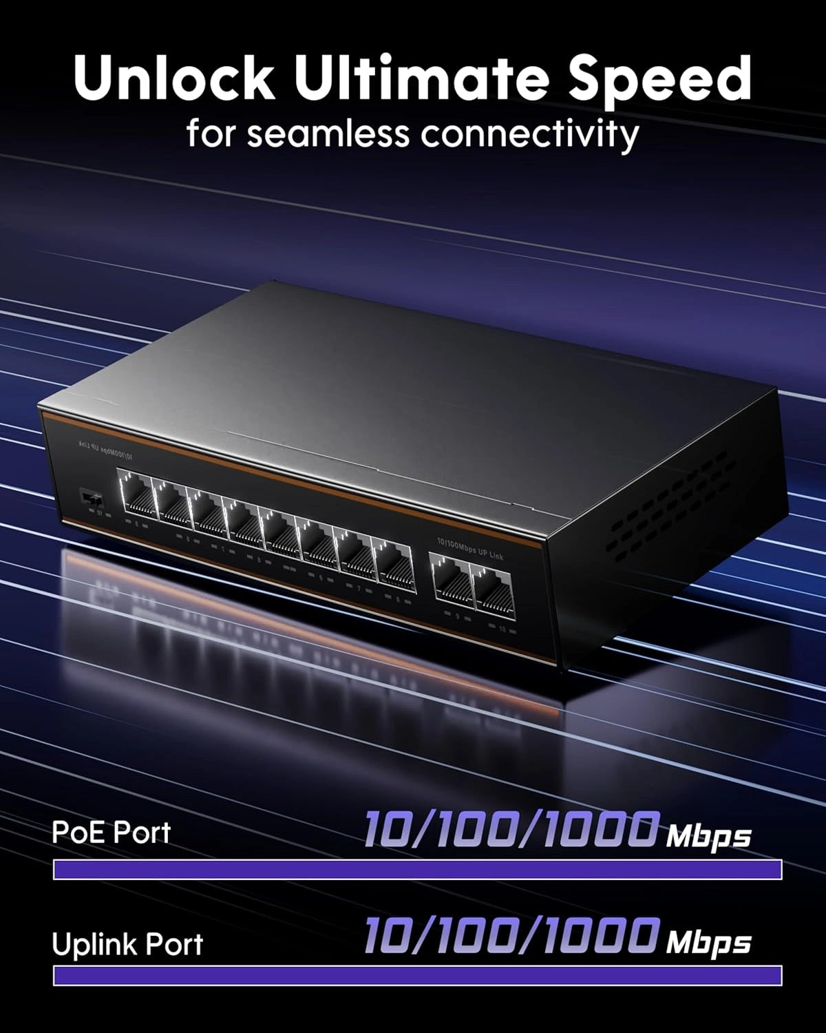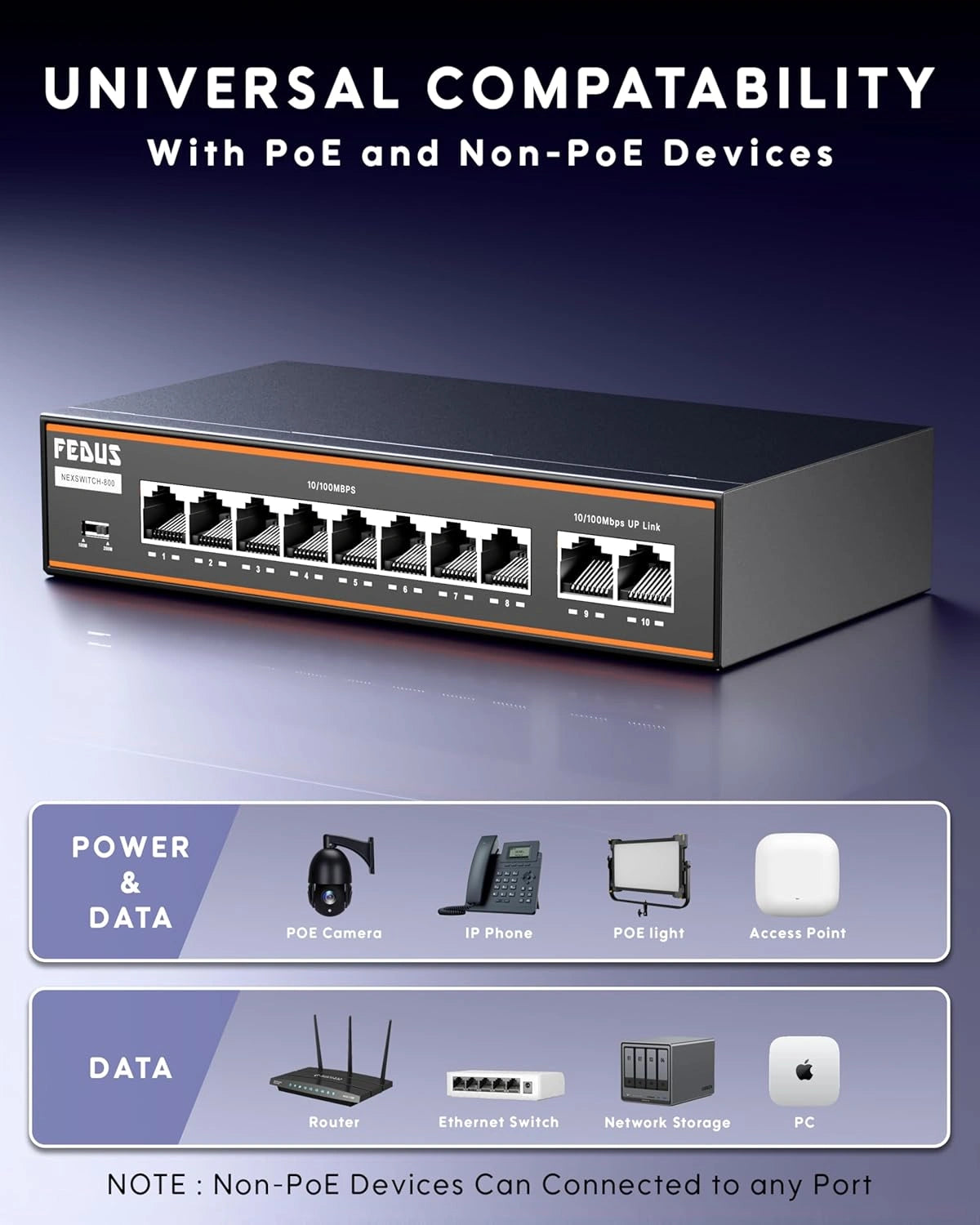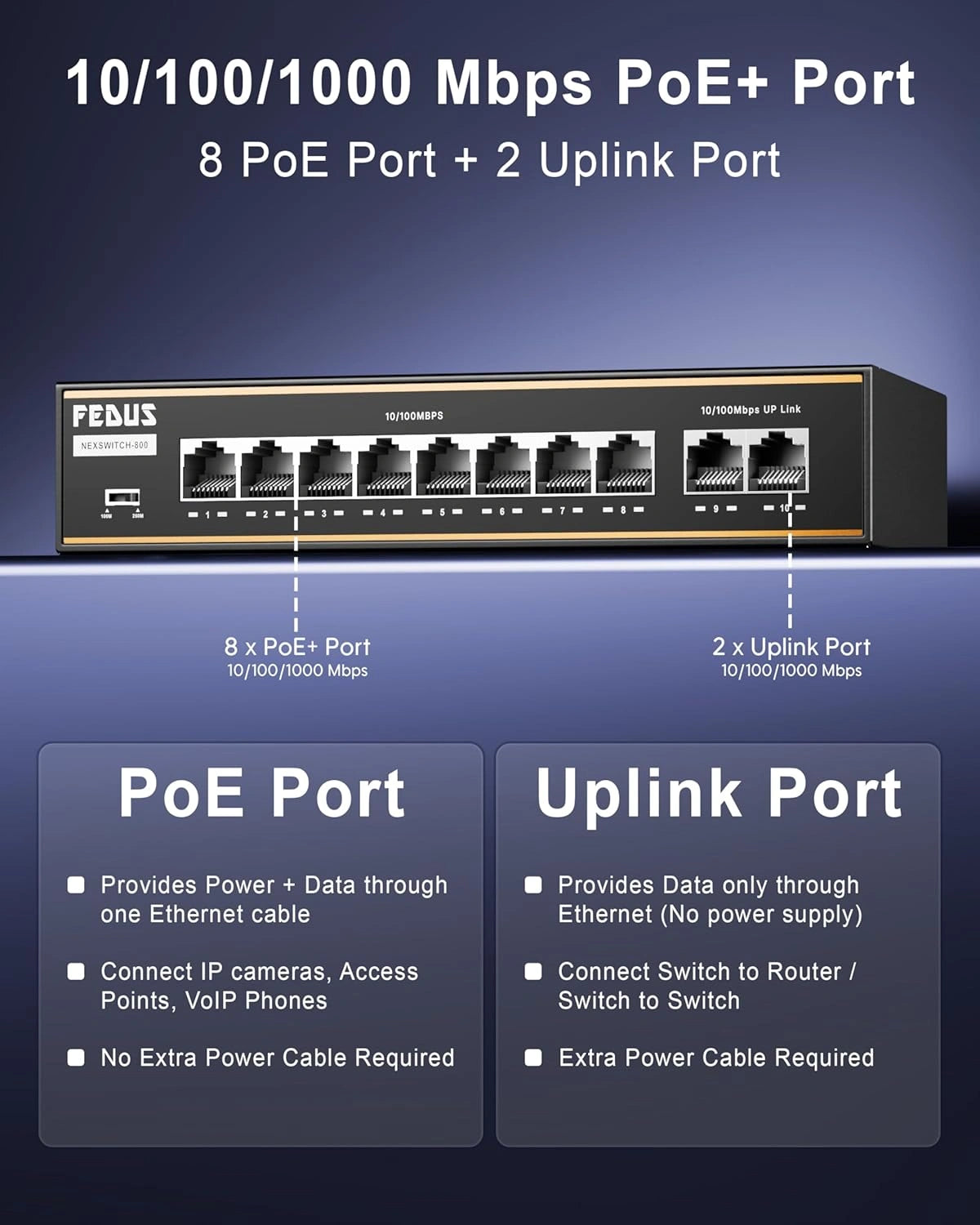 ▶ TRUE GIGABIT SPEEDS ON ALL 10 PORTS: Unlike competitor switches that only offer Gigabit on uplink ports while bottlenecking PoE ports at 10/100Mbps, the FEDUS NEXTSWITCH-8000FG delivers blazing-fast 10/100/1000 Mbps Gigabit speeds across ALL 8 PoE+ ports and both uplink ports. Enjoy zero-lag 4K IP camera streaming, seamless high-speed Wi-Fi access point data transfer, and a massive 20Gbps backplane bandwidth with zero packet loss.