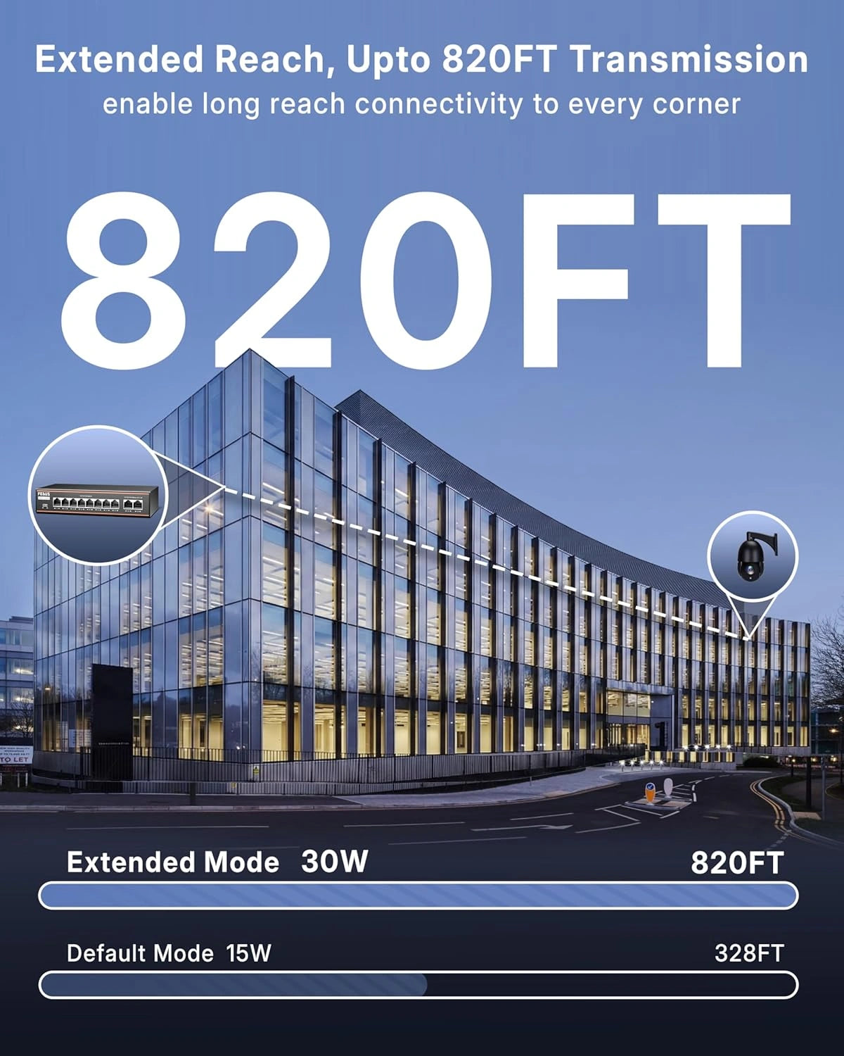 ▶ 250M VLAN EXTEND MODE FOR LONG REACH: Security installations shouldn't be limited by distance. By simply toggling the DIP switch to 'Extend Mode', you can push power and data up to 250 meters (820 ft) at 10Mbps—perfect for reaching isolated outdoor cameras without needing extra PoE extenders. In this mode, ports 1-8 are isolated from each other to prevent broadcast storms, improving network security and data transfer stability.