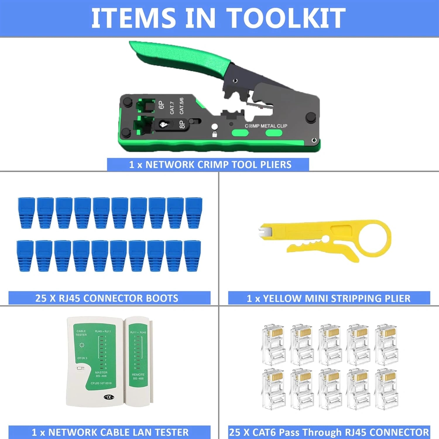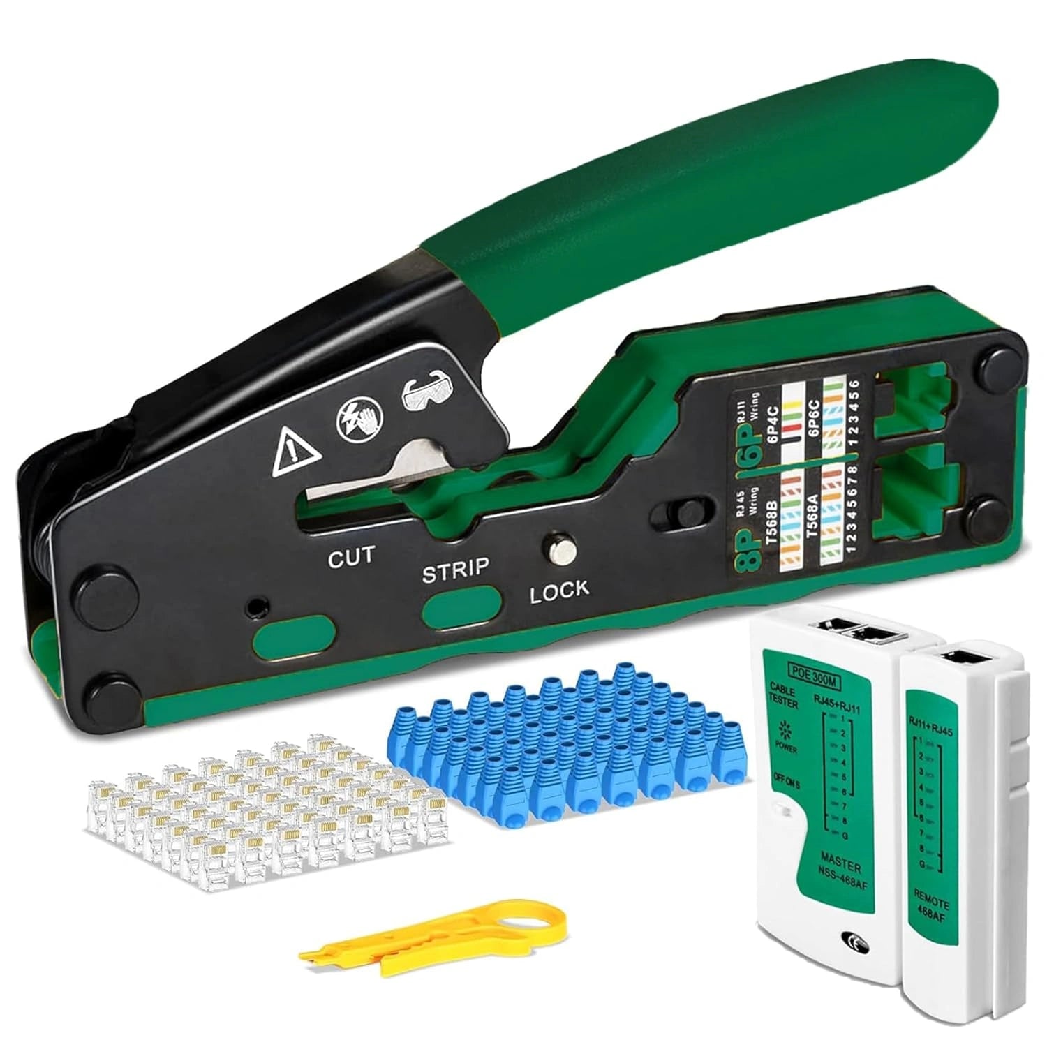 FEDUS RJ45 Crimping Tool Kit, Passthrough Crimping Tool RJ45 for Cat8 Cat7 Cat6A Cat5E Cat5 RJ45, 25PCS RJ45 Connector & Boot Covers, Network LAN Tester, Cut and Strip Tool, Green, combo-5