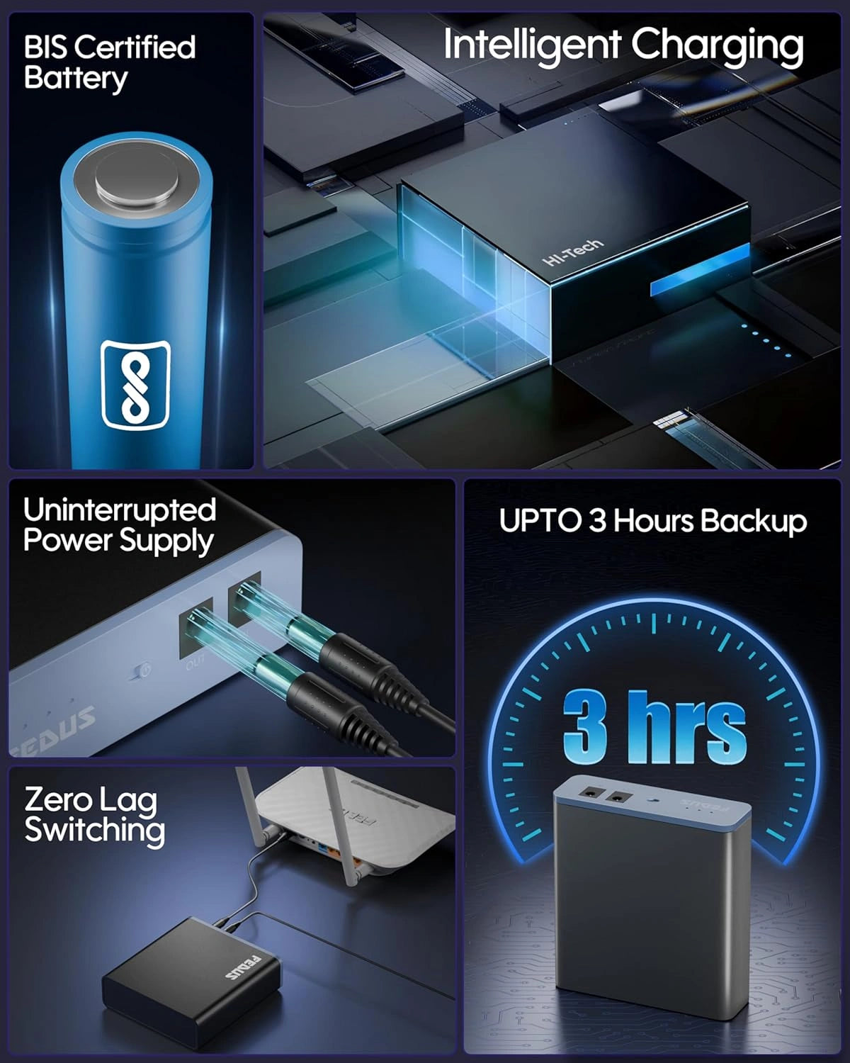 ▶HIGH-CAPACITY 4400mAh BIS CERTIFIED CELLS: Quality is at the heart of FEDUS. While other use unbranded batteries, we use two premium 'A' Grade 2200mAh BIS Certified Lithium-ion cells, totaling 4400mAh provide a consistent 3 to 4 hours of backup for standard routers. BIS certification guarantees that the battery meets stringent Indian safety standards, offering you a reliable and long-lasting power source maintains its charge capacity even after hundreds of cycles, unlike cheaper alternatives.