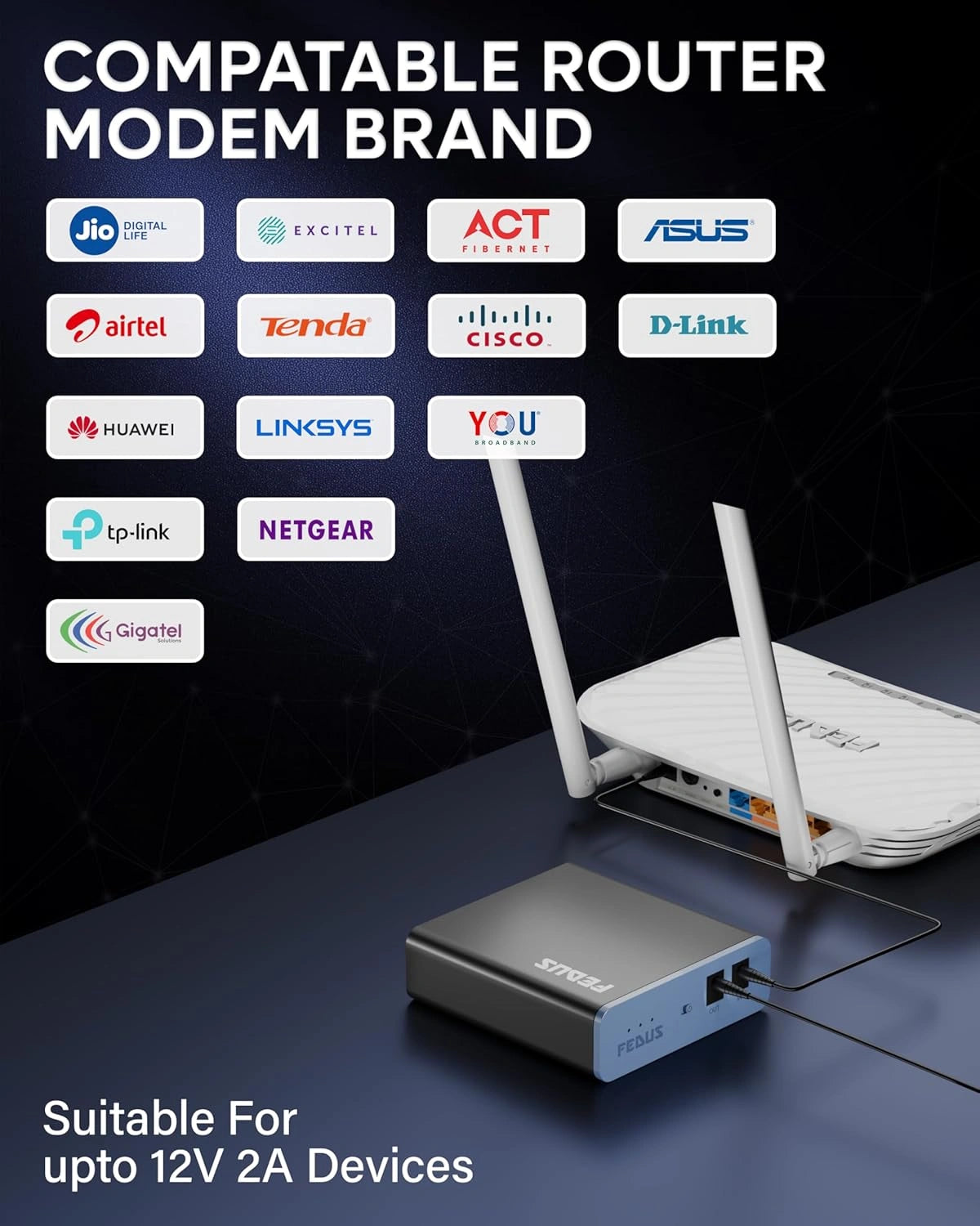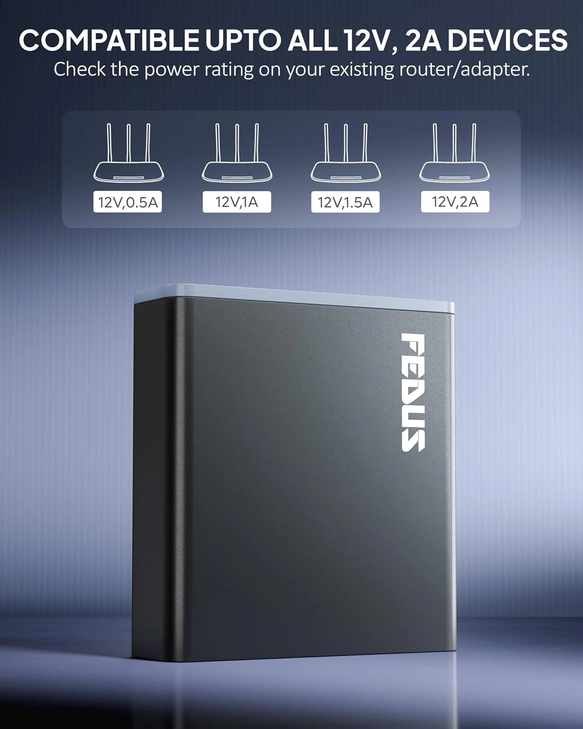 ▶UNIVERSAL 12V 2A COMPATIBILITY FOR ALL MAJOR ISP ROUTERS: Unlike basic UPS models that only support up to 1A, the FEDUS Router UPS is heavy-duty and supports up to 12V 2A loads. perfectly compatible with high-performance Dual-Band routers from JioFiber, Airtel Xstream, BSNL, ACT Fibernet, TP-Link, D-Link, Netgear etc. Whether you have a basic single-antenna modem or a power-hungry 4-antenna WiFi-6 router, this UPS delivers the exact amperage required without overheating or causing voltage drops