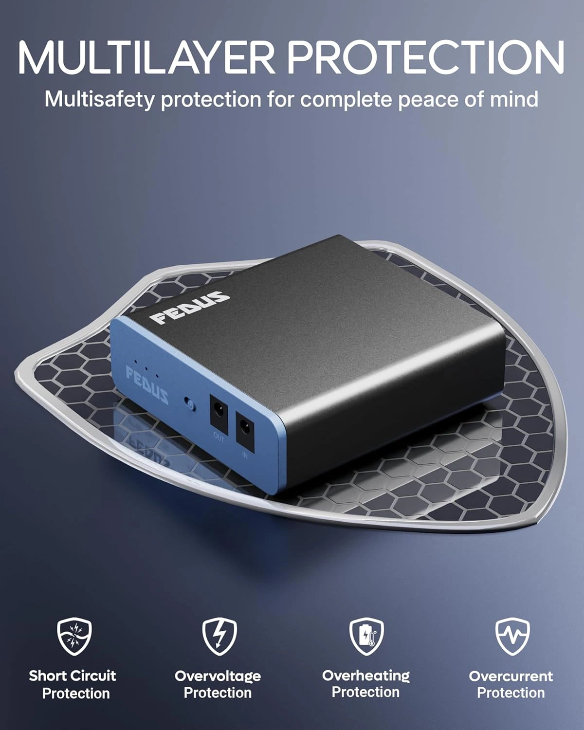 ▶INTELLIGENT CHARGING & 24/7 PLUG-AND-PLAY CONVENIENCE: One of the biggest concerns for buyers is whether they can leave the UPS plugged in all the time. The FEDUS Mini UPS features an "Intelligent Charging" system with a built-in smart chip that manages the power flow. automatically stops charging the battery once it reaches 100%, preventing overcharging and heat buildup. You can leave it connected to the power socket 365 days a year without worry,acts as a dedicated guardian for your router