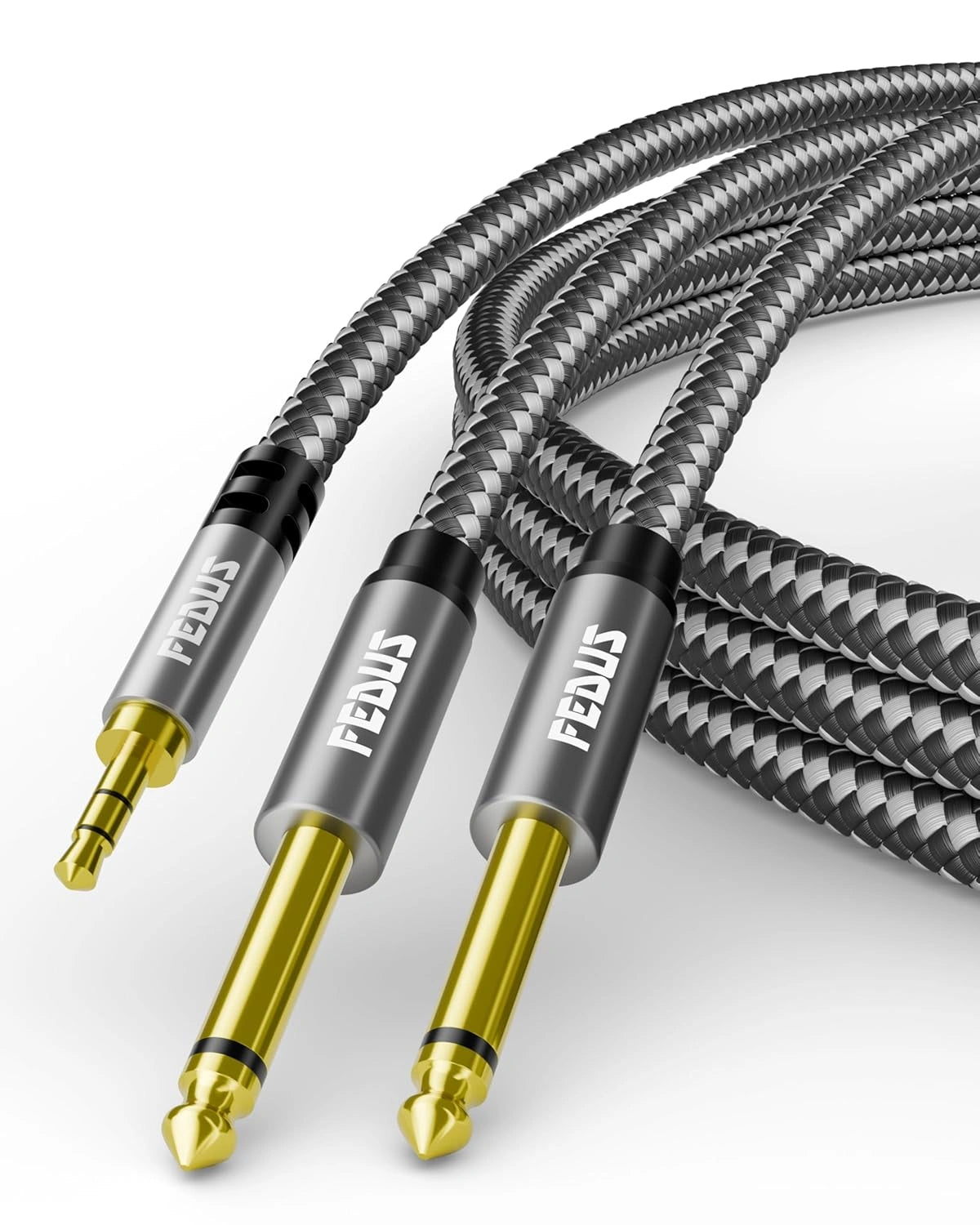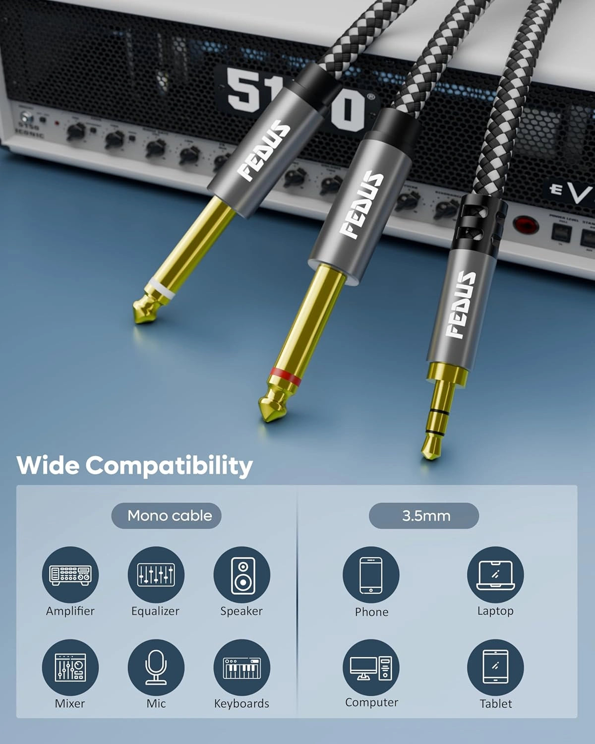 ▶1/4 TO 3.5MM ADAPTER: This 3.5mm 1/8 stereo to dual 6.35 1/4 mono cable facilitates the splitting...