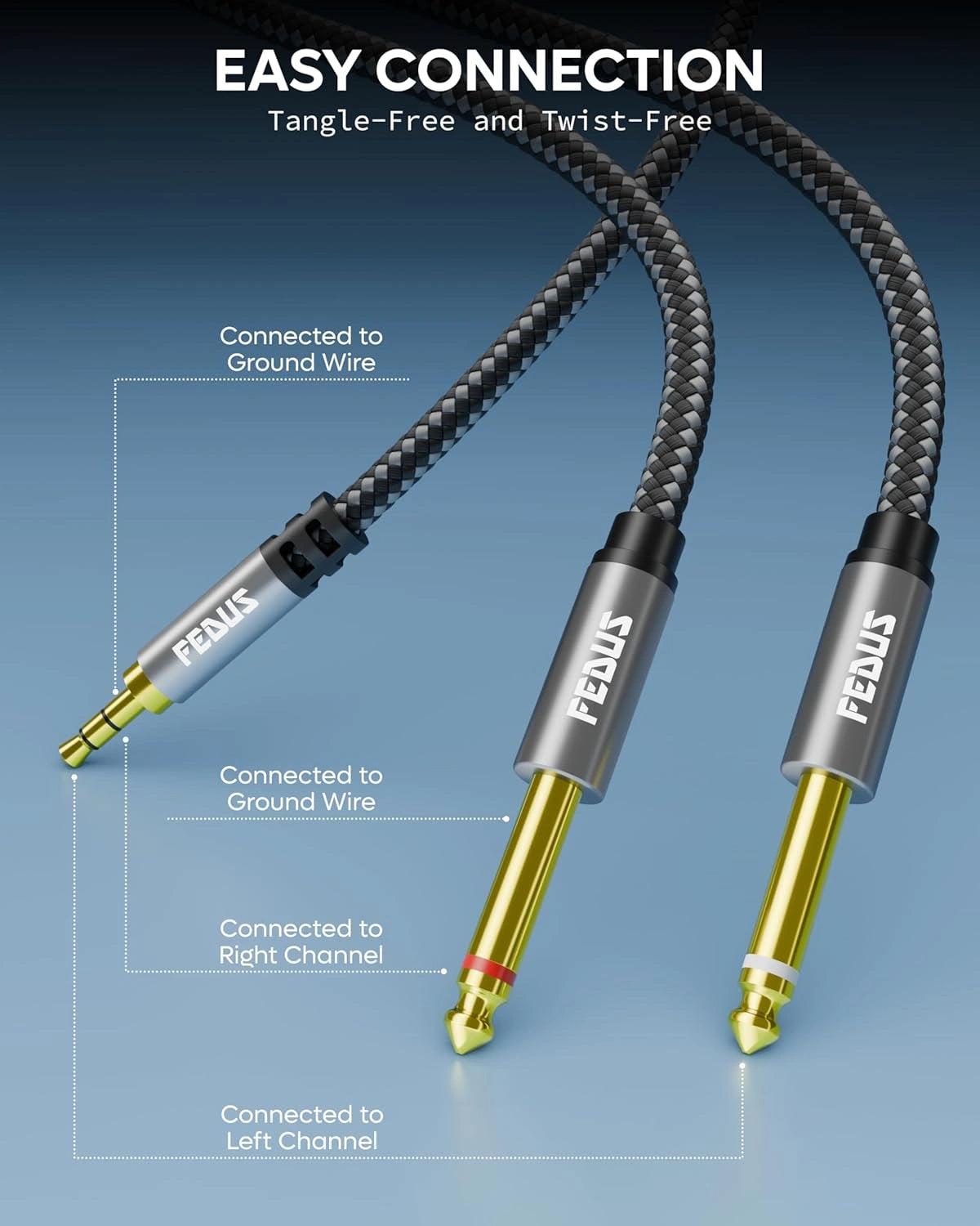 FEDUS 1.5 Meter Gold Plated Oxygen Free Copper 3.5mm 1/8" TRS to Dual 6.35mm 1/4" TS Mono Stereo Y-Cable Splitter Cord Compatible for Phones, Sound Cards, CD Players, Multimedia Speakers, Home Stereo